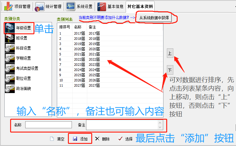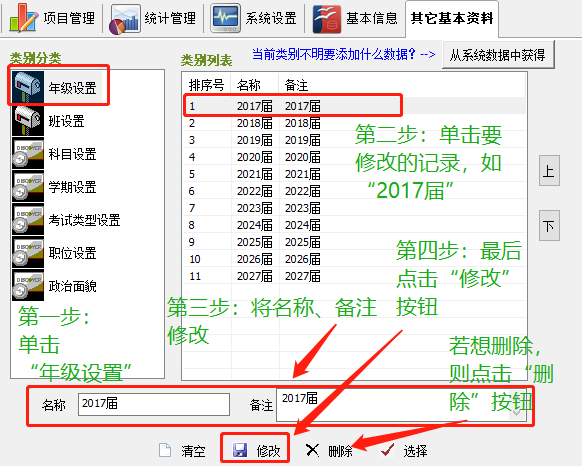 其它的项目:班、学期、科目、考试类型、职位、政治面貌,操作方式同设置年级是一样的。
