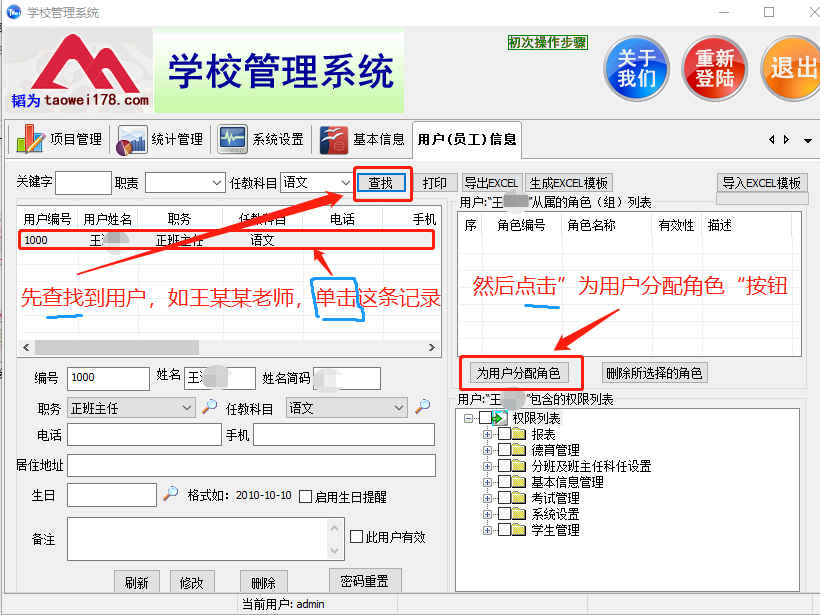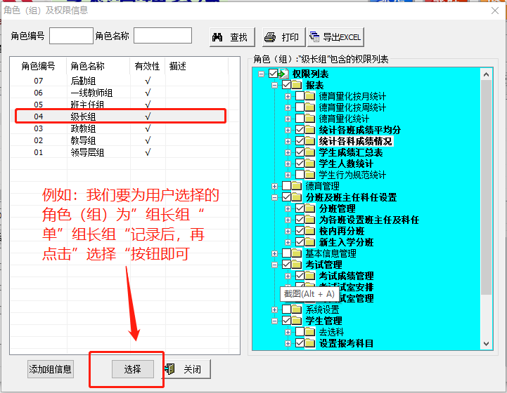 例如我们要设置”班主任组“的权限,可先单击左边列表中的”班主任组“记录,接着添加班主任到此组中,点击”为角色分配用户“,在弹出的窗口中查找到班主任并勾选,”确定“后,即可将刚刚的班主任添加到了右边列表中;