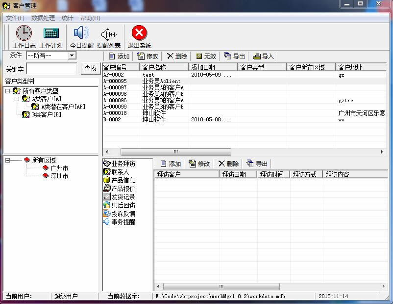 客户资料:按客户类型和所在区域及关键字查找客户,可对客户列表每列进行排序,从EXCEL导入导出客户资料,并对客户资源进行管理。